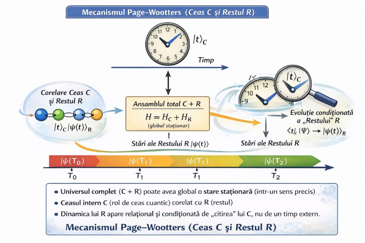 Figura prezintă ideea centrală a mecanismului Page–Wootters: ansamblul total (Ceasul cuantic C + Restul R) poate fi descris global ca fiind staționar (fără a presupune un timp extern privilegiat), dar pentru un observator intern care folosește C drept referință, Restul R pare să evolueze. Această „evoluție” este relațională: ea apare din corelațiile (de obicei entanglement) dintre C și R și din condiționarea pe o citire a ceasului. Sus (Ceasul cuantic C). Ceasul C este reprezentat printr-o familie de stări notate |t〉_C, care corespund unor „citiri” diferite. Axa „Timp” sugerează că aceste stări pot fi ordonate și folosite ca etichete interne t. Important: în această imagine, t nu este un timp extern impus universului, ci o coordonată definită operațional de ceasul C. Centru (Ansamblul total C + R și Hamiltonianul). Cutia centrală arată că „universul” considerat este bipartiționat în C (ceas) și R (restul). În varianta simplificată din figură, Hamiltonianul total este sugerat ca H = H_C + H_R. Mesajul pedagogic: la nivel global (C+R) nu introducem din start o evoluție față de un parametru temporal extern; în schimb, „timpul” relevant va fi cel definit de ceasul intern C. Stânga (Corelarea dintre C și R). Bula din stânga subliniază că C și R nu sunt independente: apar corelații de forma |t〉_C ⊗ |ψ(t)〉_R. Intuitiv, pentru fiecare citire posibilă a ceasului C, restul R este asociat cu o stare corespunzătoare |ψ(t)〉_R. O scriere schematică a ideii este că starea globală poate fi văzută ca o superpoziție de astfel de „perechi corelate”: |Ψ〉 ≈ Σ_t |t〉_C ⊗ |ψ(t)〉_R (unde suma poate fi, după caz, și o integrală). Dreapta (Evoluția condiționată a lui R). În dreapta apare pasul cheie: dacă „fixăm” o citire a ceasului (de exemplu, ceasul indică t), atunci descrierea lui R devine starea condiționată obținută prin proiecție pe C. Formula din figură, 〈t|_C |Ψ〉 → |ψ(t)〉_R, exprimă tocmai acest lucru. Din perspectiva unui observator intern care folosește ceasul C, dependența stării lui R de t este interpretată ca dinamica lui R. Jos (Secvența de stări ale lui R). Banda colorată de jos reprezintă „filmul” stărilor condiționate ale lui R: la citirea T0 a ceasului, R este în |ψ(T0)〉_R; la citirea T1, R este în |ψ(T1)〉_R; la citirea T2, R este în |ψ(T2)〉_R etc. Concluzia vizuală este că o succesiune aparent temporală a stărilor lui R poate apărea din corelația cu C, chiar dacă descrierea globală a ansamblului C+R este staționară.
